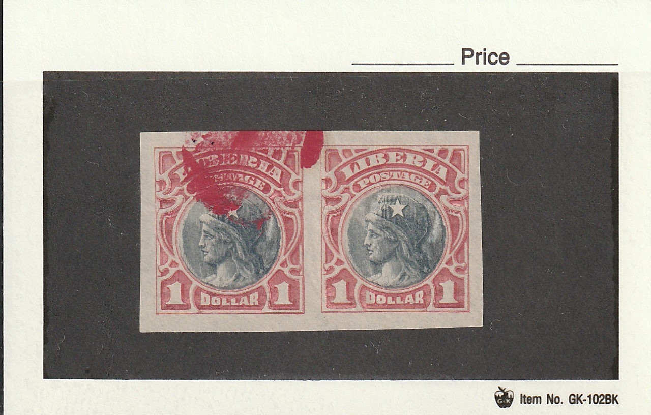 In 1973 i got a copy of 'Liberian Philatelic Material' from O.E. Lynch thru the LPS. It has 62 pages showing many diff stamps with errors and other mistakes. On page 11 it shows #111 imperf pair with red ink smeared. I came across this pair last year and added to my collection of #101-113. Just this past week i opened the book that i got in 1973 and saw #111. It was the same pair that i got last year. What Goes Around-Comes Around. Here are the photos.